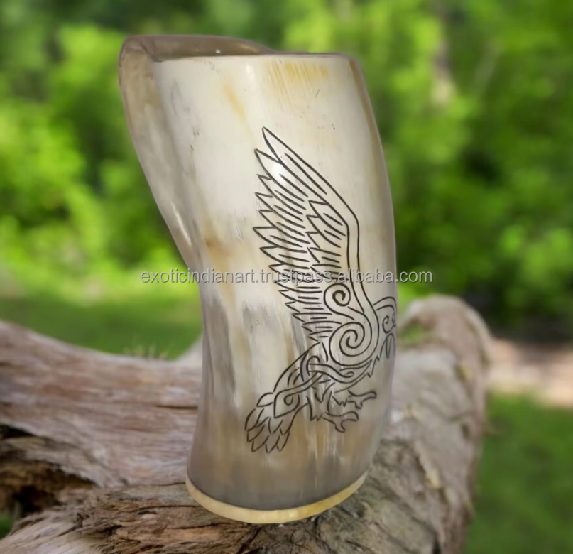 Viking Religious Style Polished Glass Drinking Horn Mug Bird Design Natural Crafts for Men Women for Ale Mead Beer Souvenirs