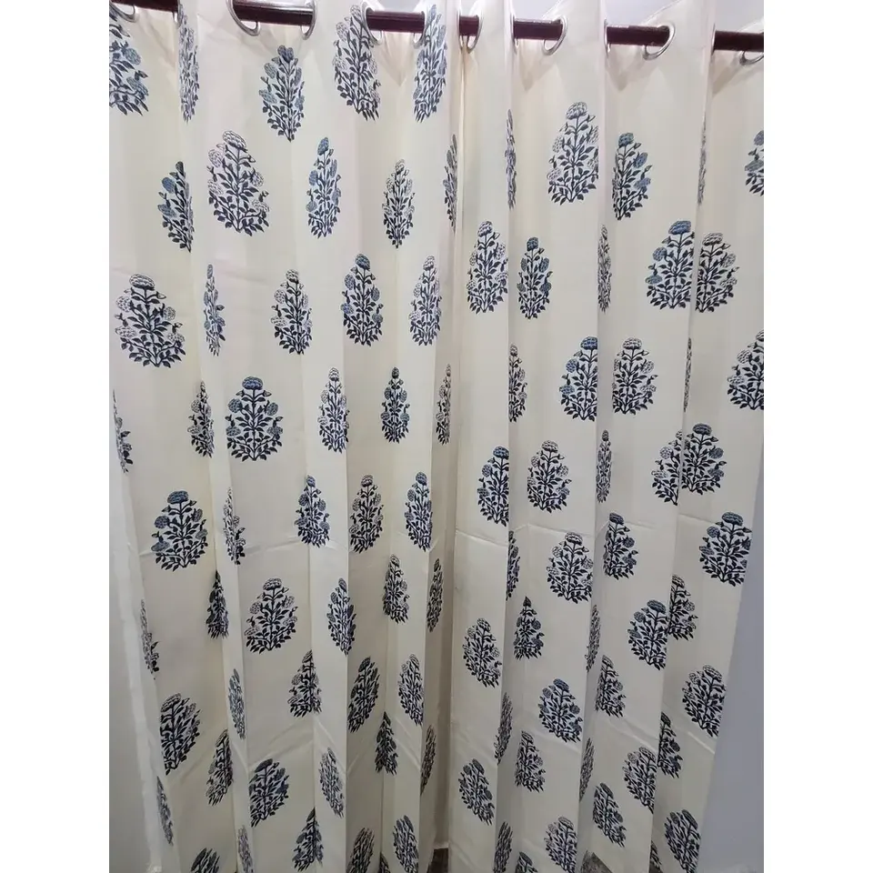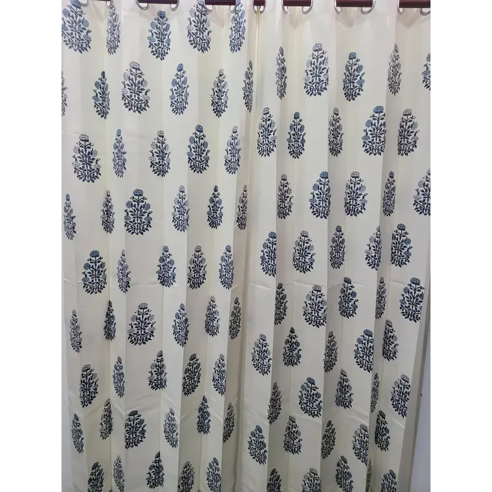 Vinayakam Hand Block Printed Cotton Curtains & Valances White Bass Mugal Blue Butta 8-Loop
