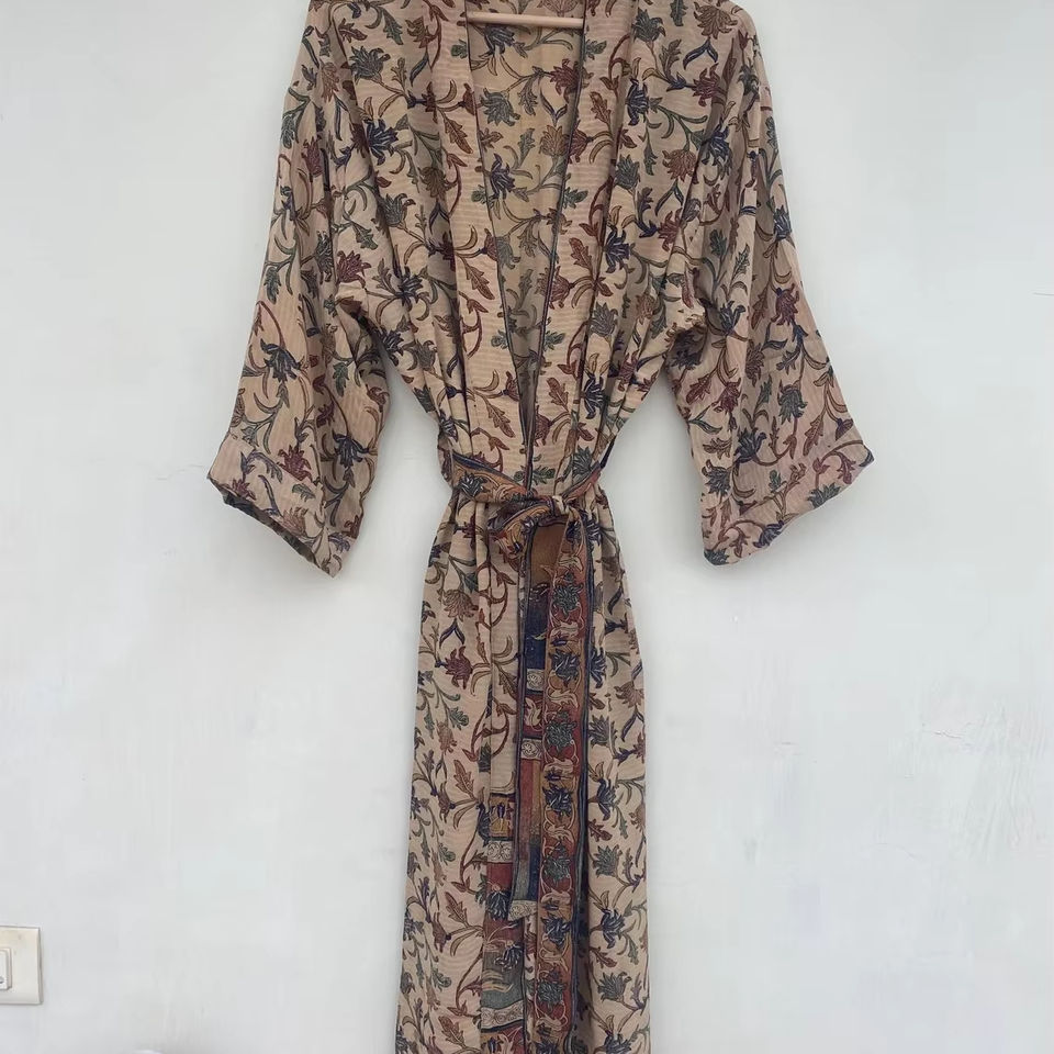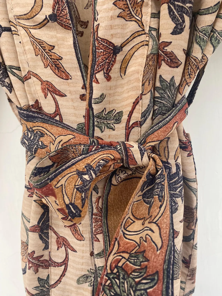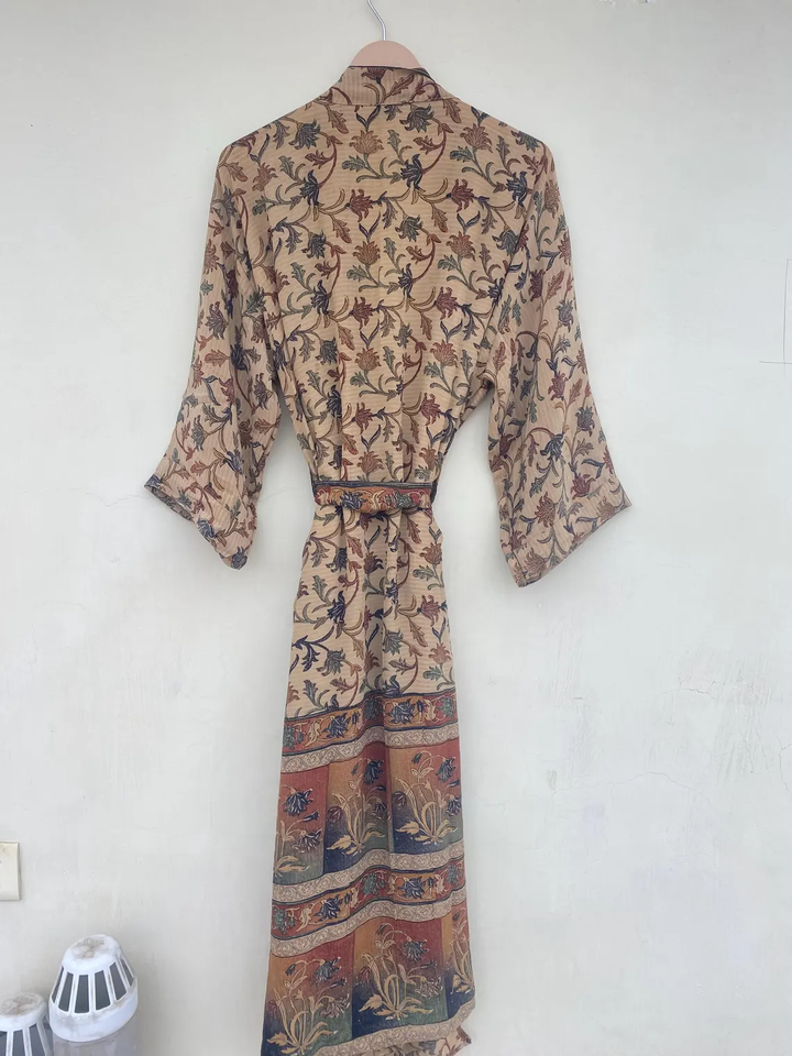 Vintage 100% Silk Kimono for Women Beige and Brown with Belt Quick Dry Beach Wear for Summer Autumn & Spring Free Size