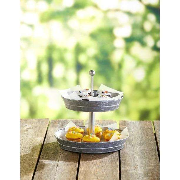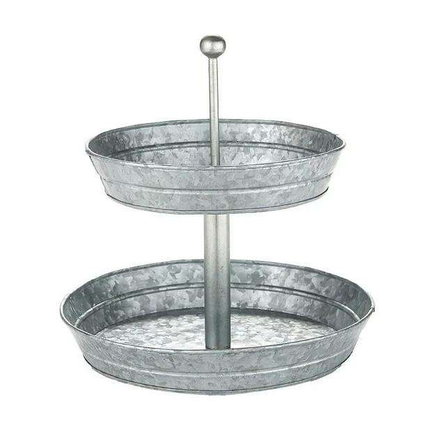 Vintage 2-Tier Galvanized Metal Tray Functional for Kitchen Crafts and Seasonal Holiday Decor Use with Dishes and Bowls