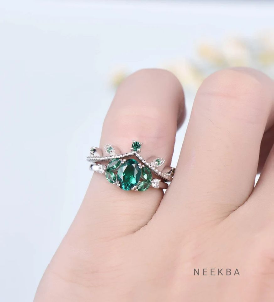 Vintage 2 pcs Bridal Ring Set with Oval Cut Lab-Emerald Green Gemstone Wedding Ring Set in 925 Silver Handcrafted in India