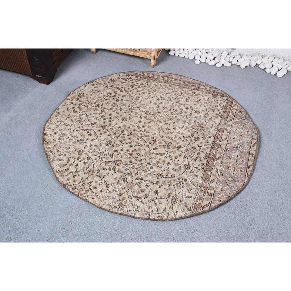 Vintage 3.9 X 3.9 ft Wool Rug in Beige and Brown Patchwork Pattern for Living Room Bedroom or Teen's Room with Latex Backing
