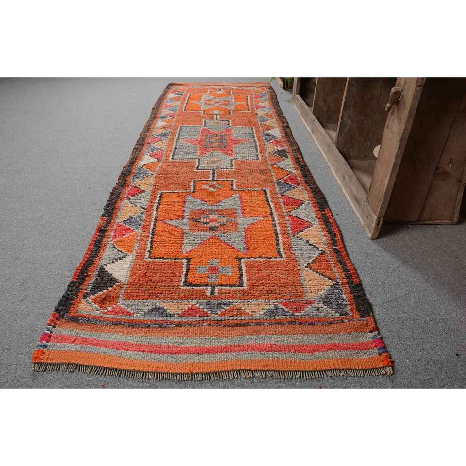 Vintage 3 X 9.7ft Turkish Rug Orange & Gray Patchwork Classic Style Wool and Viscose Material Latex Backing for Living Room