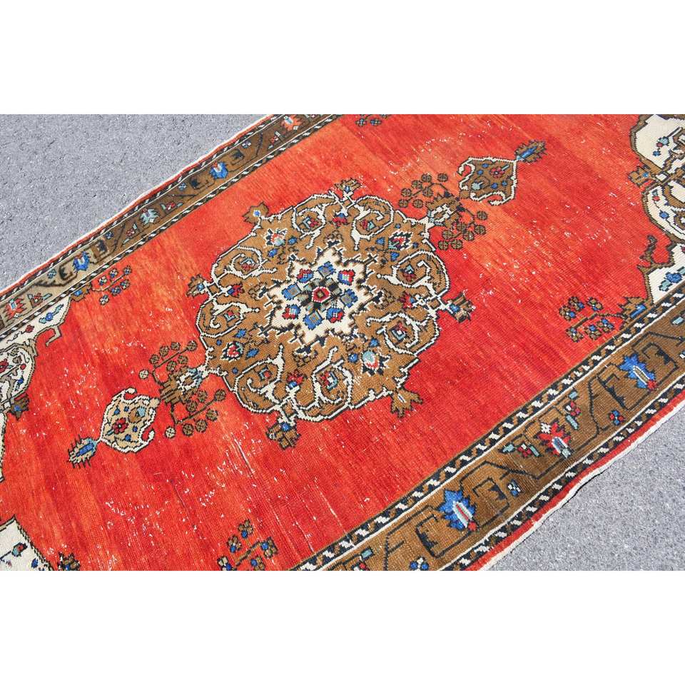 Vintage 4ft 8in Turkish Wool Rug Red Brown Patchwork Design Flat Weave Technique for Living Room Decor 10mm Thickness Latex