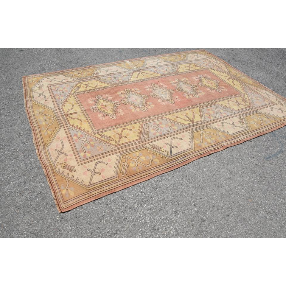 Vintage 7 X 9.3 ft Eco Friendly Wool Rug Orange Yellow Geometric Patchwork Pattern Dining Room Medium Pile Latex Backed