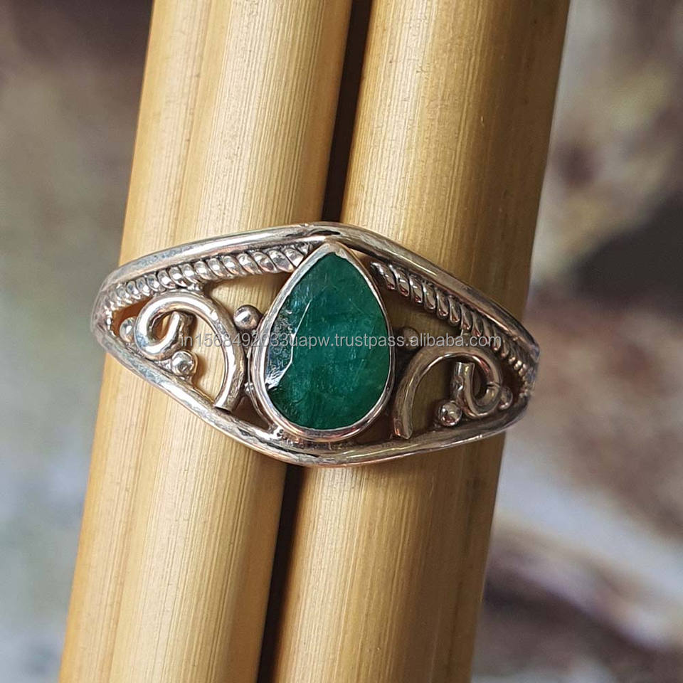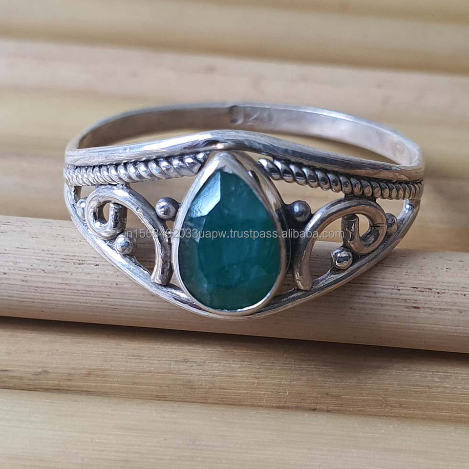 Vintage 925 Sterling Silver Engagement Ring Designer Green Emerald Corundum Pear Shape Gemstone Gold Fine Wedding Gift Jewelry