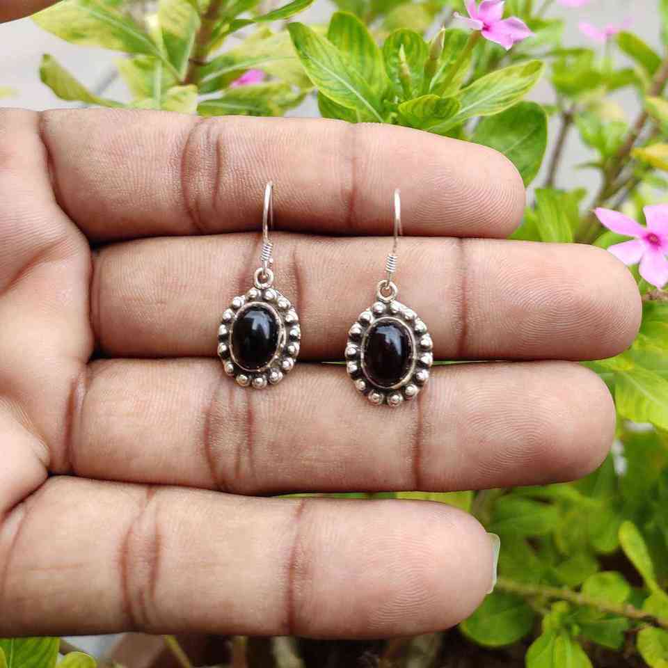 Vintage 925 Sterling Silver French Hoop Earrings Minimalistic Boho Black Onyx Gemstone Cabochon Fine Dangle Artisan Crafted