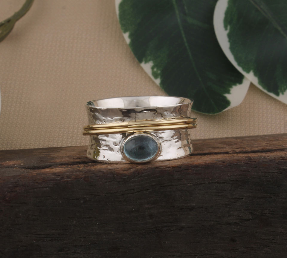 Vintage 925 Sterling Silver Handmade Engraved Spinner Ring with Aquamarine Gemstone Women's Fidget Meditation Jewelry Wedding