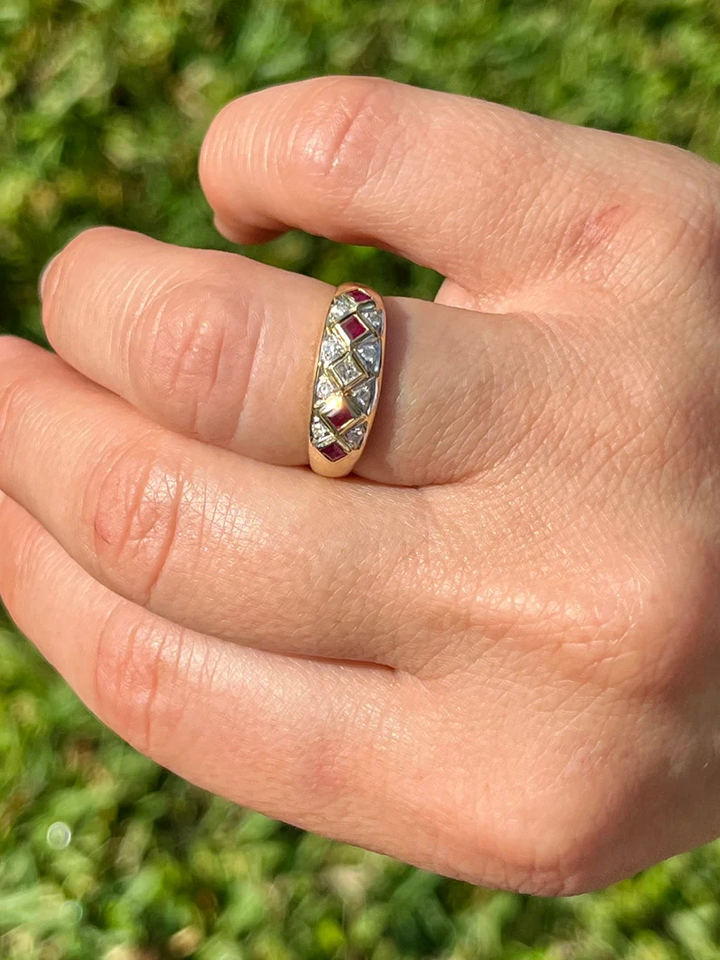 Vintage Art Deco Square Pattern Ring For Women Real 18k Yellow Gold Plated Natural Diamond Ruby IGI Certified Fashionable Jade