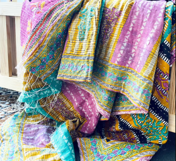 Vintage Bangali Kantha Quilt Indian Handmade Reversible Breathable Eco-Friendly All-Season 100% Cotton Printed Patchwork Bed