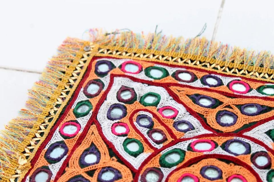 Vintage Banjara Yoke Mirror Work Patch Appliques Embroidery Handcrafted Fabric Decorated with Rhinestones for Clothes Design