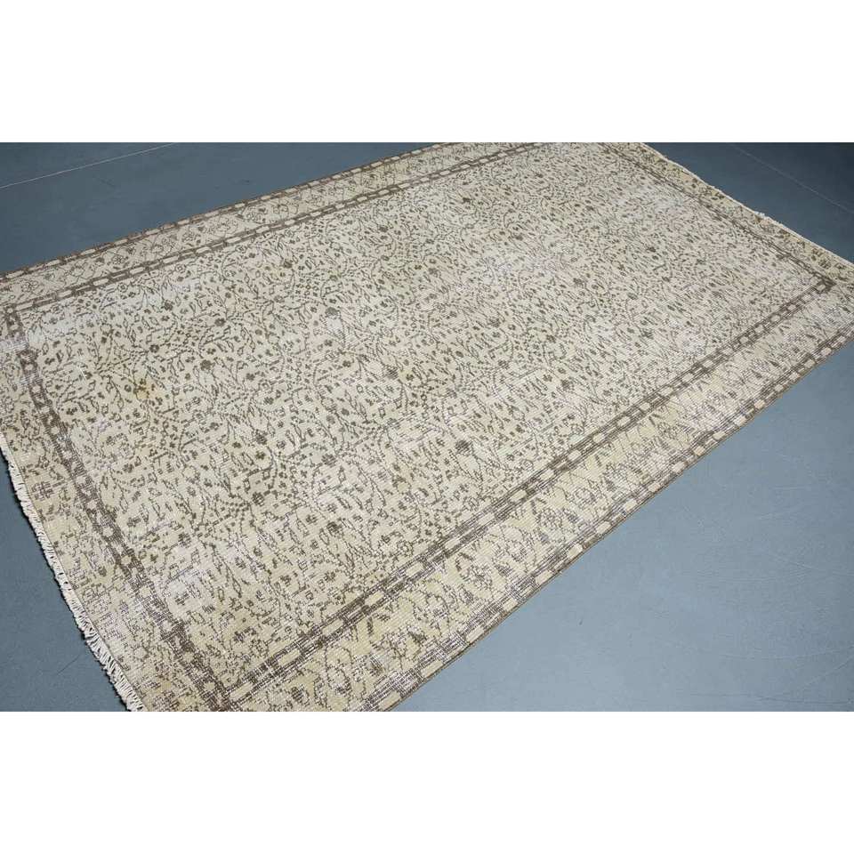 Vintage Beige Brown Wool Flat Weave Rug Classic Boho Aubusson Design 5.5' X 8.3' Patchwork Pattern for Living Room Latex Backing