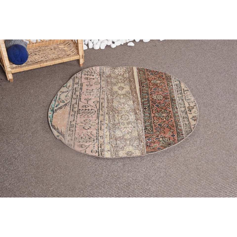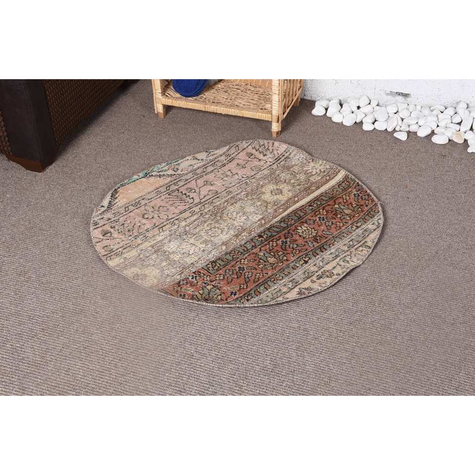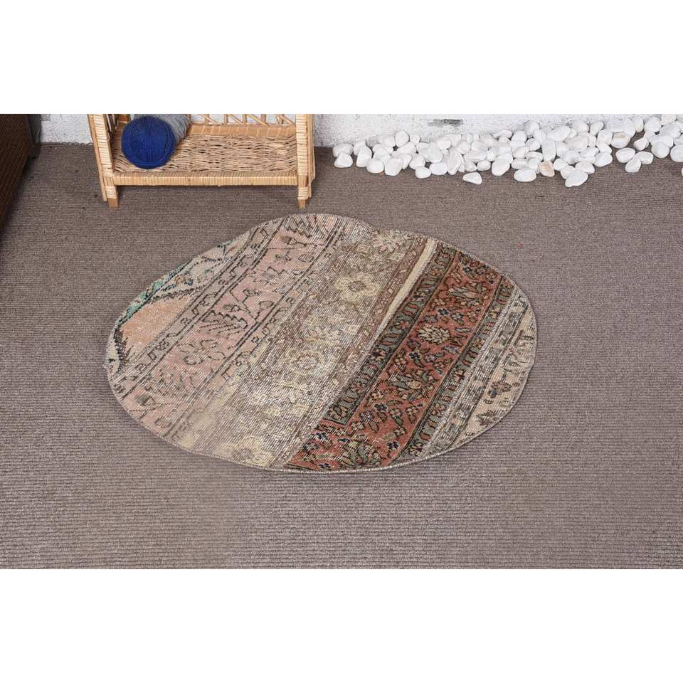 Vintage Beige Brown Wool Patchwork Rug Large Area 2,9 X 2,9 ft Handmade Rectangle Hallway Made Bamboo Silk Polyester Latex