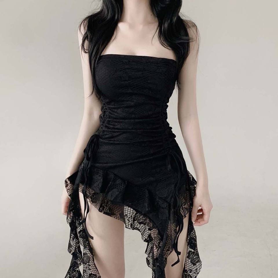 Vintage Black Lace Strapless Irregular Mini Dress Women Slim Fit Sexy Party Nightclub Dress