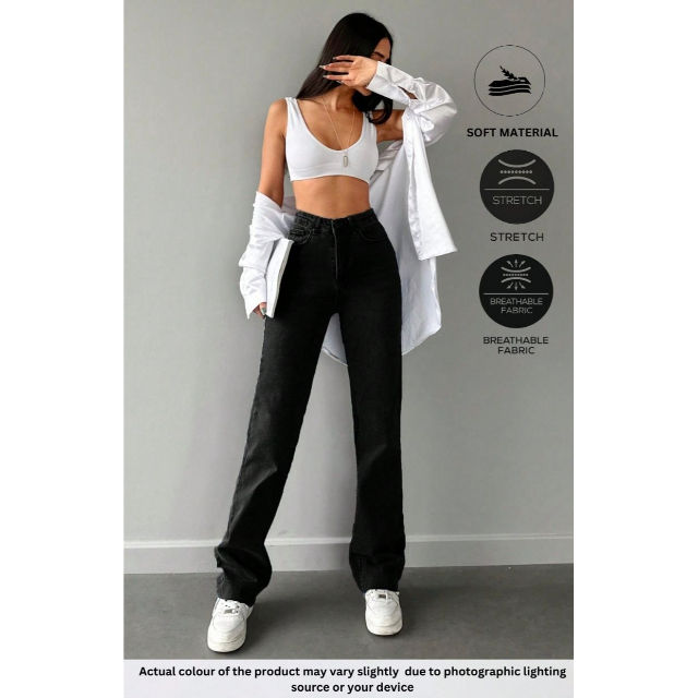 Specifications:Fit Type: Wide Leg / Loose Fit., Waist Type: High Waist., Fabric: Stretch Denim (Cotton + Stretch Denim)., Length: Full Length (Approx. 40 inches)., Closure Type: Zipper Fly with Metal Button., Pattern Type: Solid / Plain., Pocket Type: 5-Pocket Classic Design., Stitching: Double-Needle Durable Stitch., Details: Clean Look / Minimalist Finish / Premium Thread Work., Fabric Features: Breathable., Wash Type: Enzyme Wash / Soft Finish., Usage: Casual Wear.