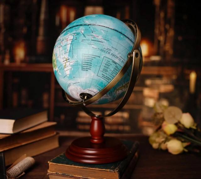 Vintage Blue Ocean World Globe with Rotating Axis and Wooden Base for Educational Learning Office Desk Home Decoration