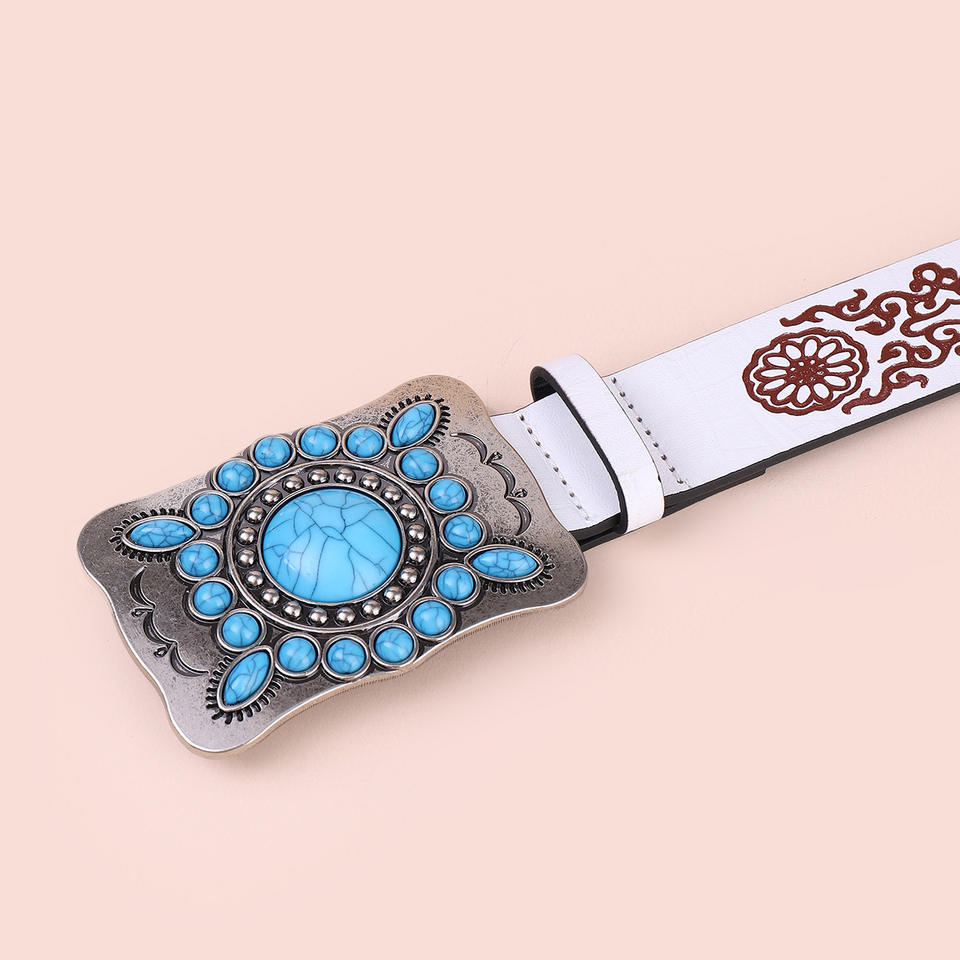 Vintage Blue Turquoise Ethnic Designer Women's Wide Genuine Leather PU Belt Custom Length Simple Carved Alloy Buckle Western