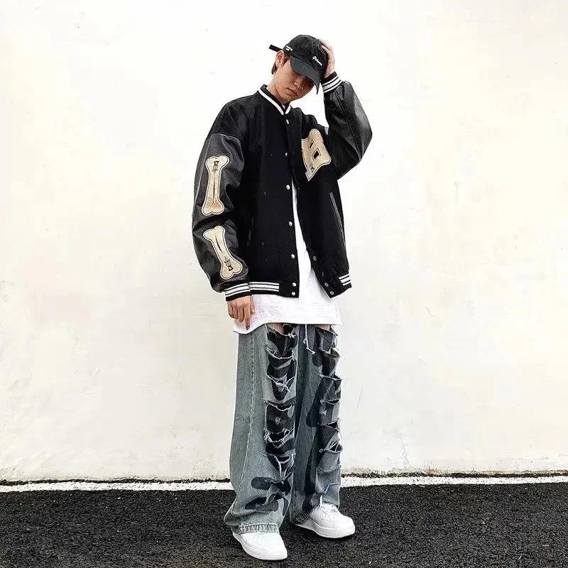 Vintage Genuine Leather Varsity Jacket Men's Plush Letterman Bomber Hip Hop Coat Oversize Waterproof Windproof High Street Green