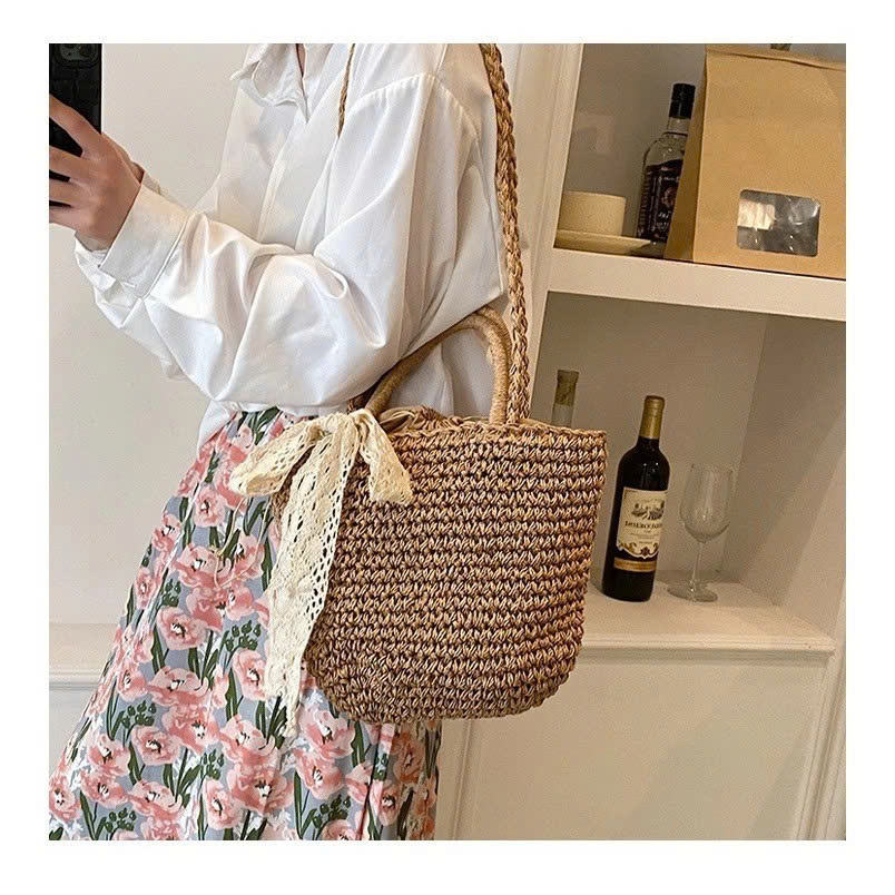 Vintage Bow Straw Bag for Women Handwoven Seagrass Beach Tote with Drawstring & Lining, Elegant Shoulder or Hand