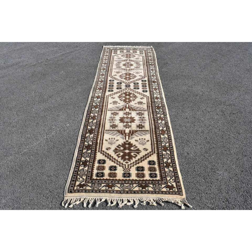 Vintage Brown Beige Turkish Rug 3 X 9.5ft Large Area Rectangle Patchwork Design Wool Material Latex Backing Abstract Room Rug