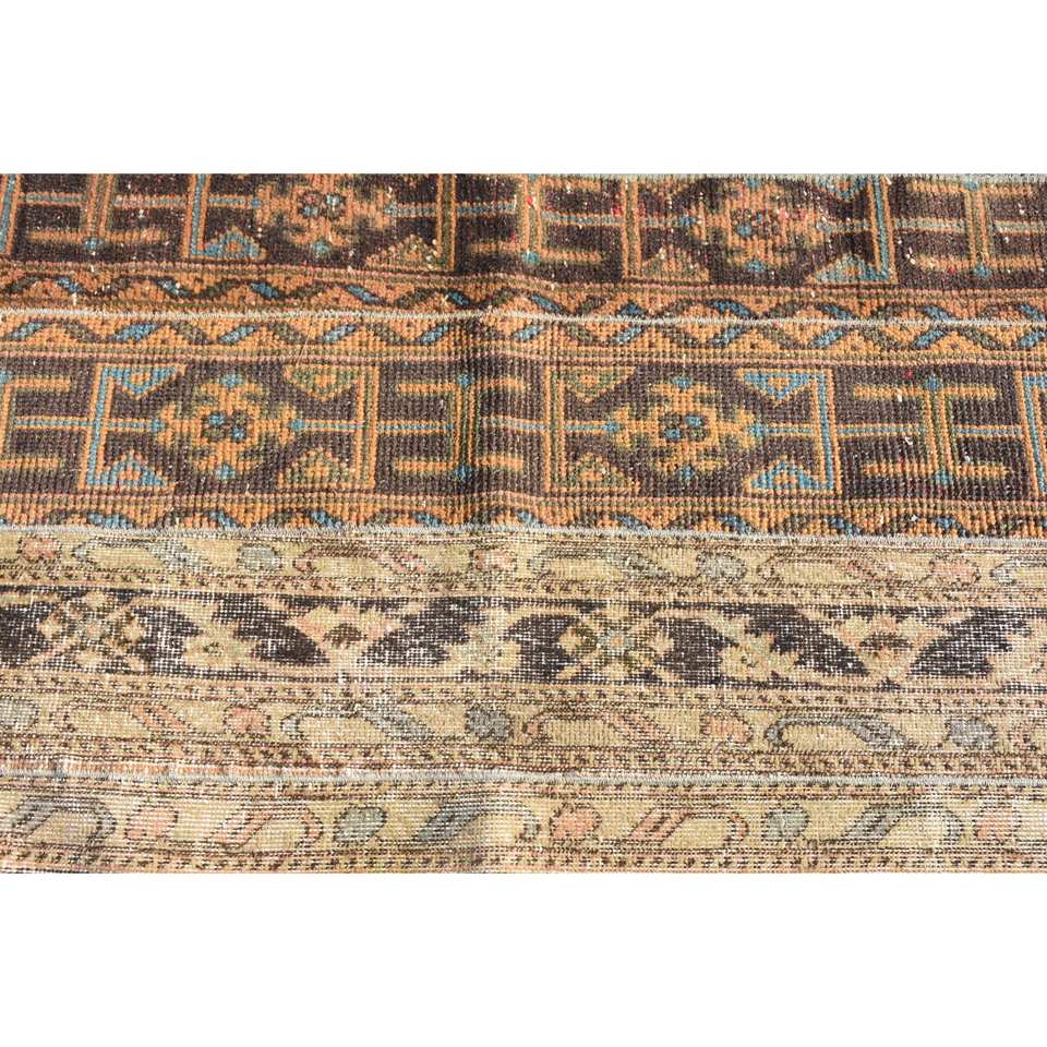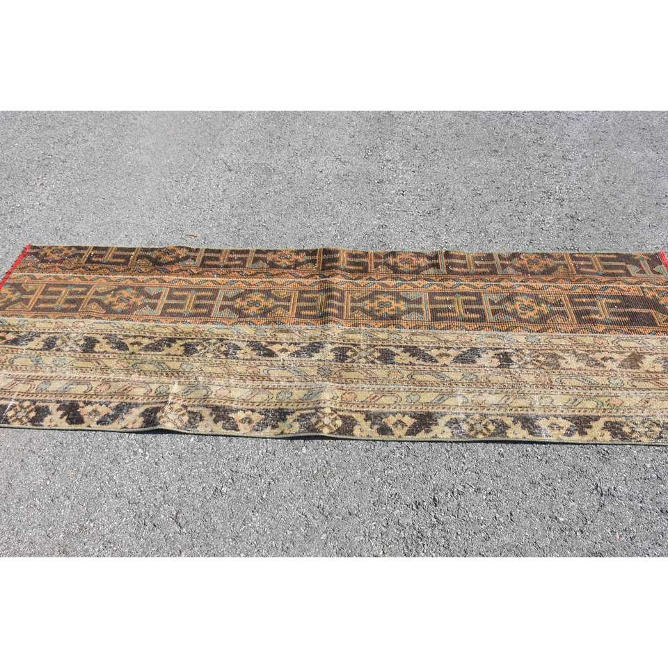 Vintage Brown Beige Wool Rug 2.7 X 7.8ft Classic Turkish Style Handmade Patchwork Design for Bedside Latex Backed