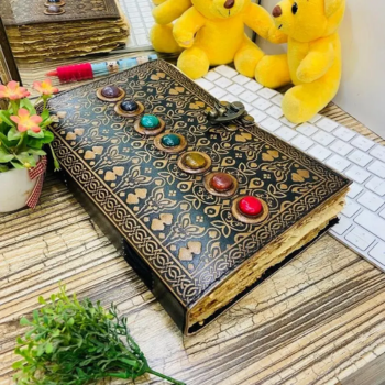Vintage Charcoal Leather Journal With Seven Stone Embossed Design & Lock Closure 200-page Antique Deckle Edge Paper 9x6 Inch