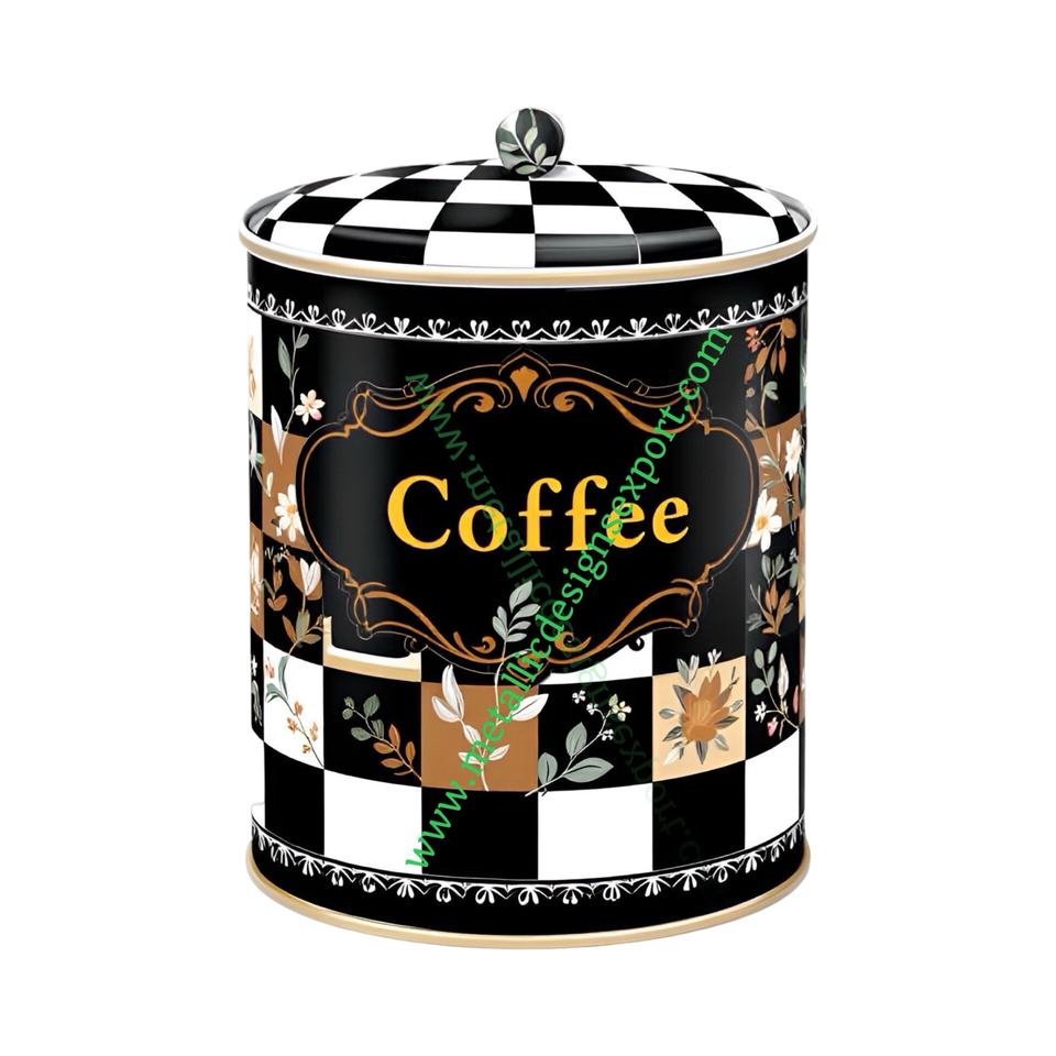 Vintage Checkerboard Coffee Canister Elegant Label Airtight Metal Storage Jar Floral Accents Cover Condiments for Kitchen Decor