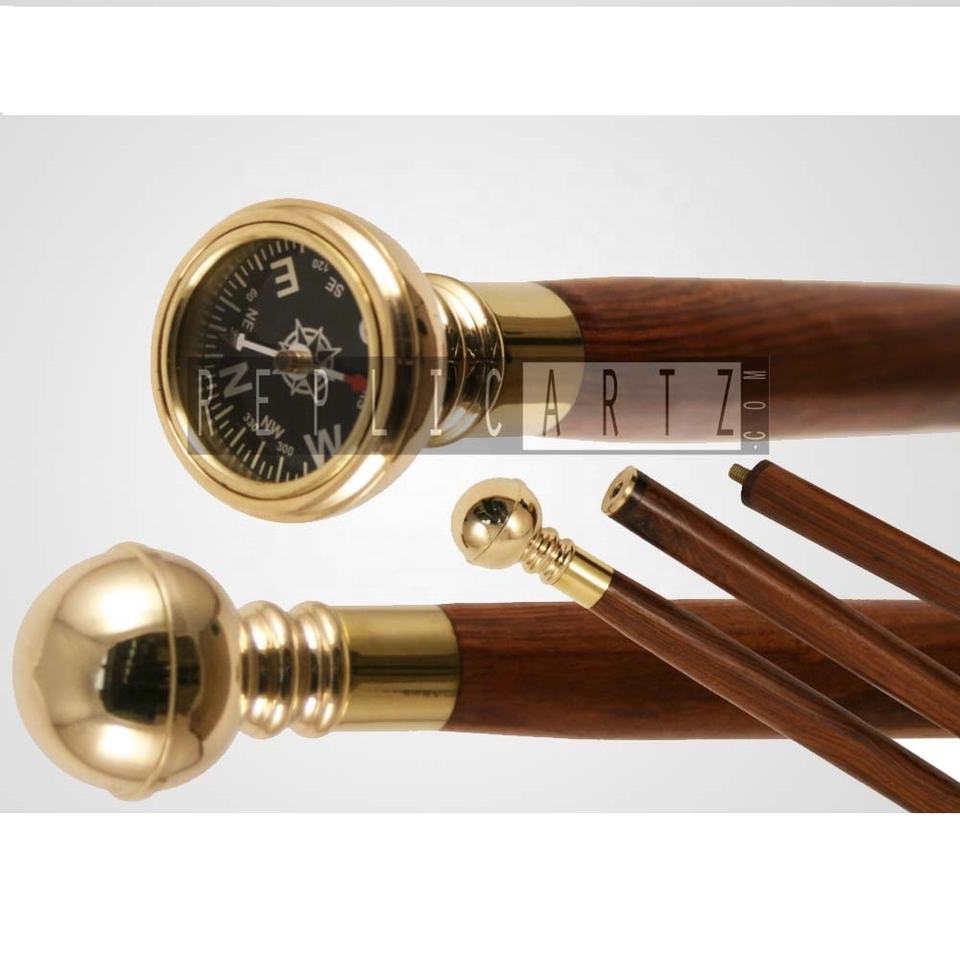 Vintage Compass Gentleman's Walking Stick, Brass Handle and Wooden Walking Cane Fashionable Vintage Handcrafted
