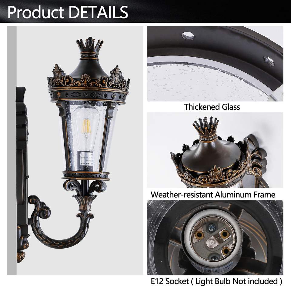 Vintage Crown Top Clear Glass Decorative Outdoor Wall Lamp Waterproof Exterior Wall Sconce for Patio Entryway-One Piece No Bulb