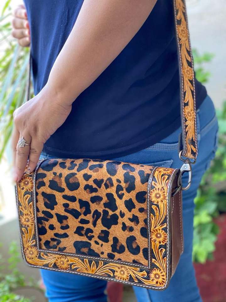Product name:Leopard Print Leather Sling Bag Hand Tooled Handbag