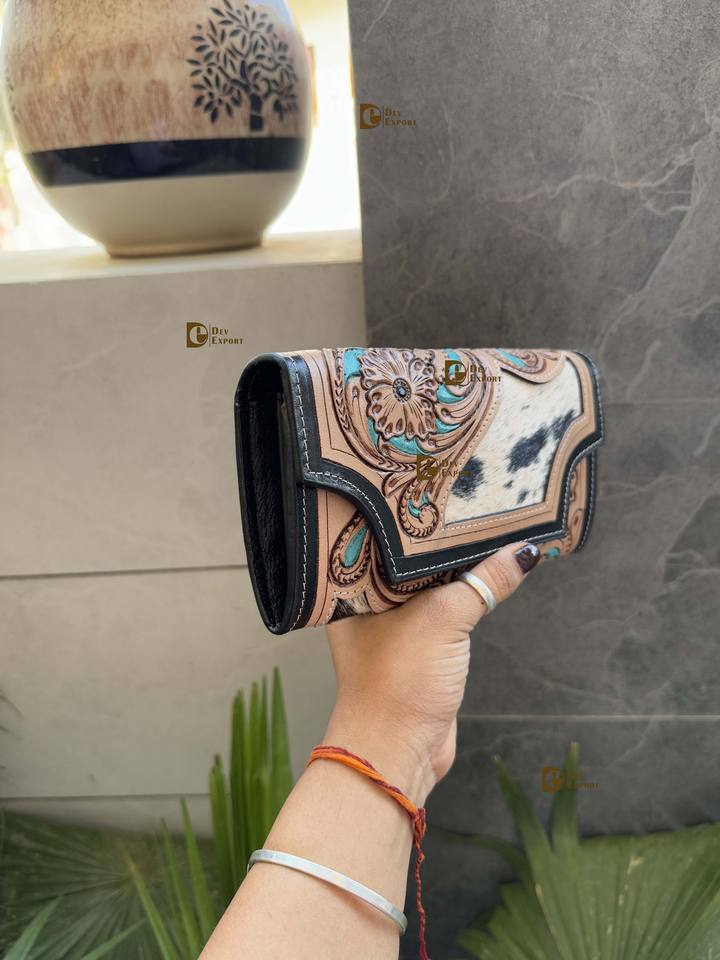 Vintage Designer Wallet Hand Tooling Carving Clutch Embroidery Waterproof Fur Trim Snap Closure Multi-purpose Credit Cards Cash