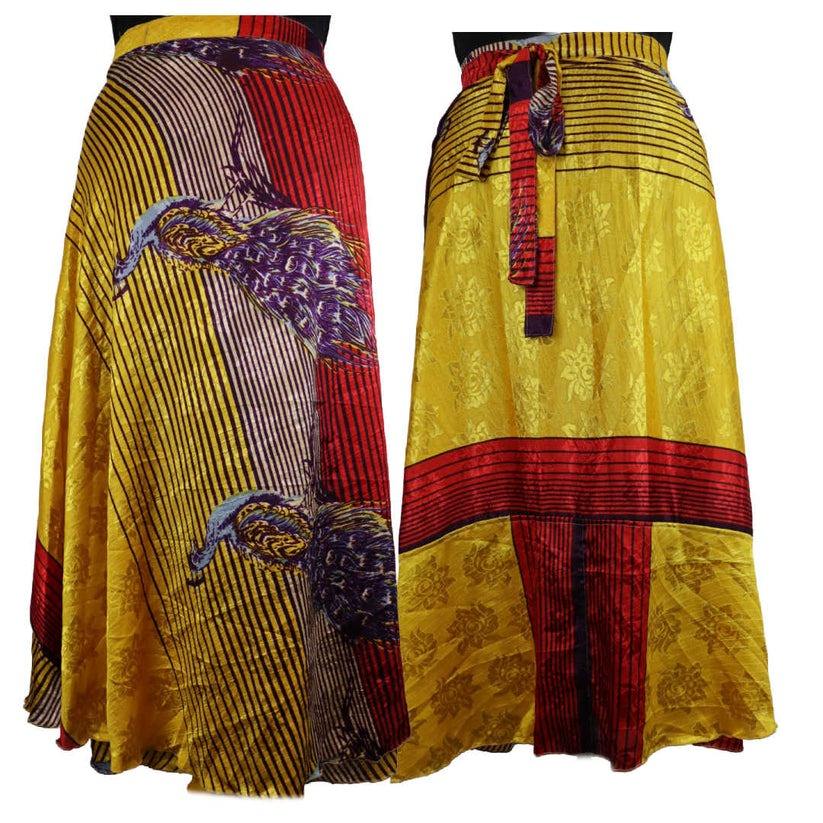 Vintage Double Layer Silk Sari Skirt for Women Multicolor Asymmetrical Casual Outings Tie Waist Gypsy Style Sequined Ripped Silk