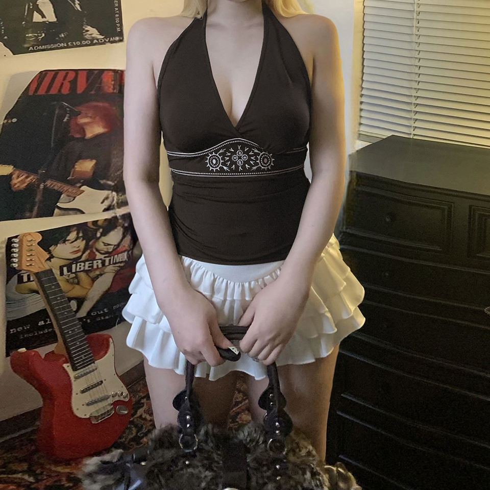 Vintage Embroidered V Neck Tank Top Women High Waist Tie Front A Line Sleeveless Blouse Slim Fit Elegant Top