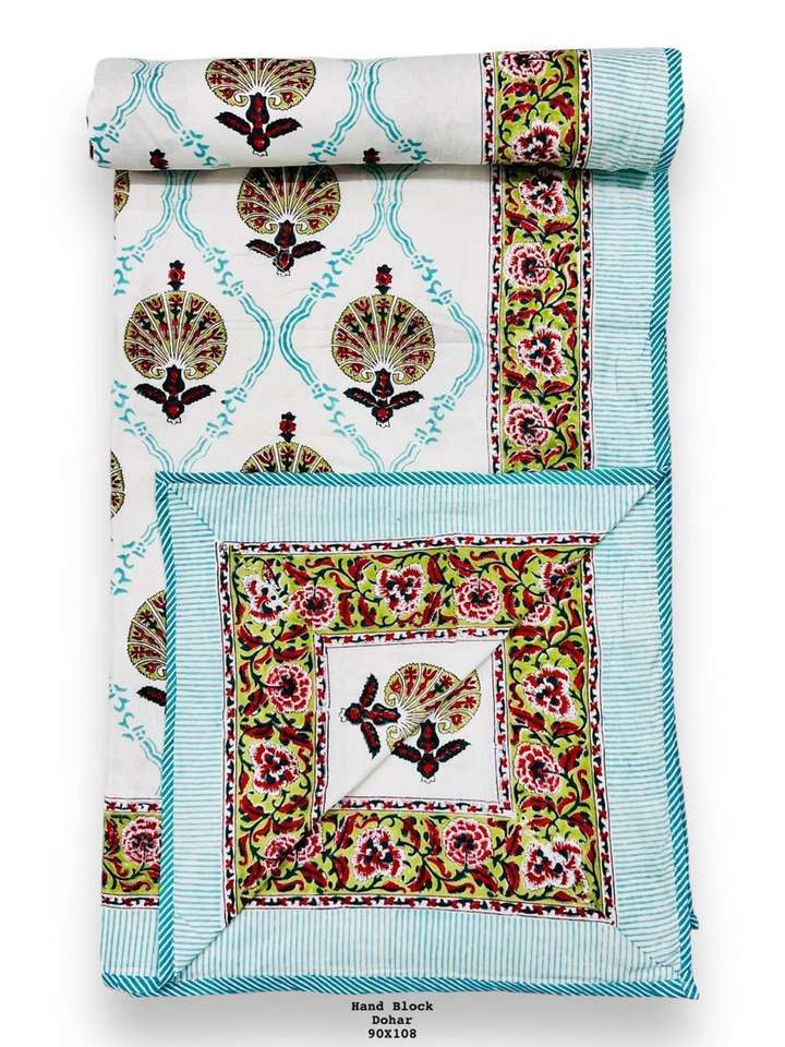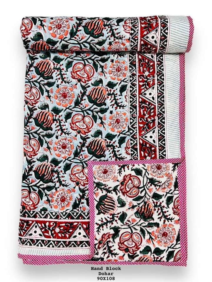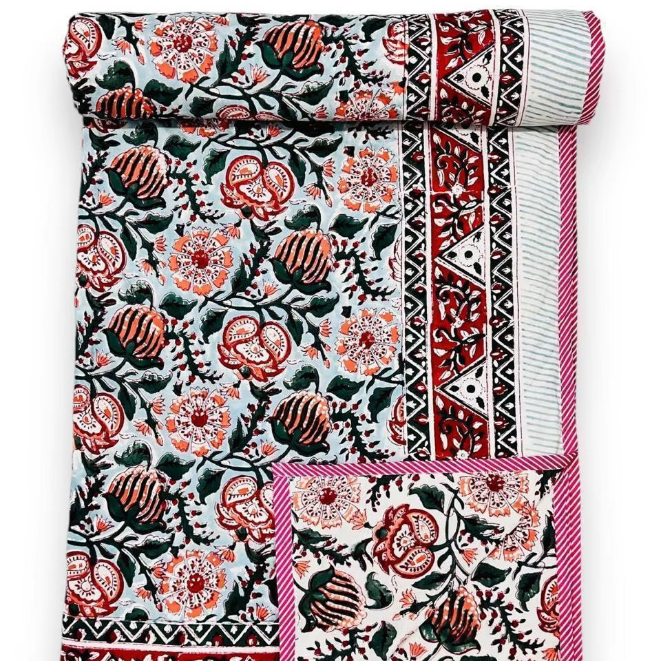 Vintage Ethnic Kantha Quilt Luxury Cotton Floral Printed Bed Cover Hand Stitched Block Work Modern 100% Cotton Washable Hotel