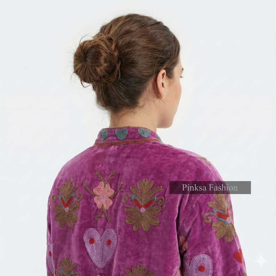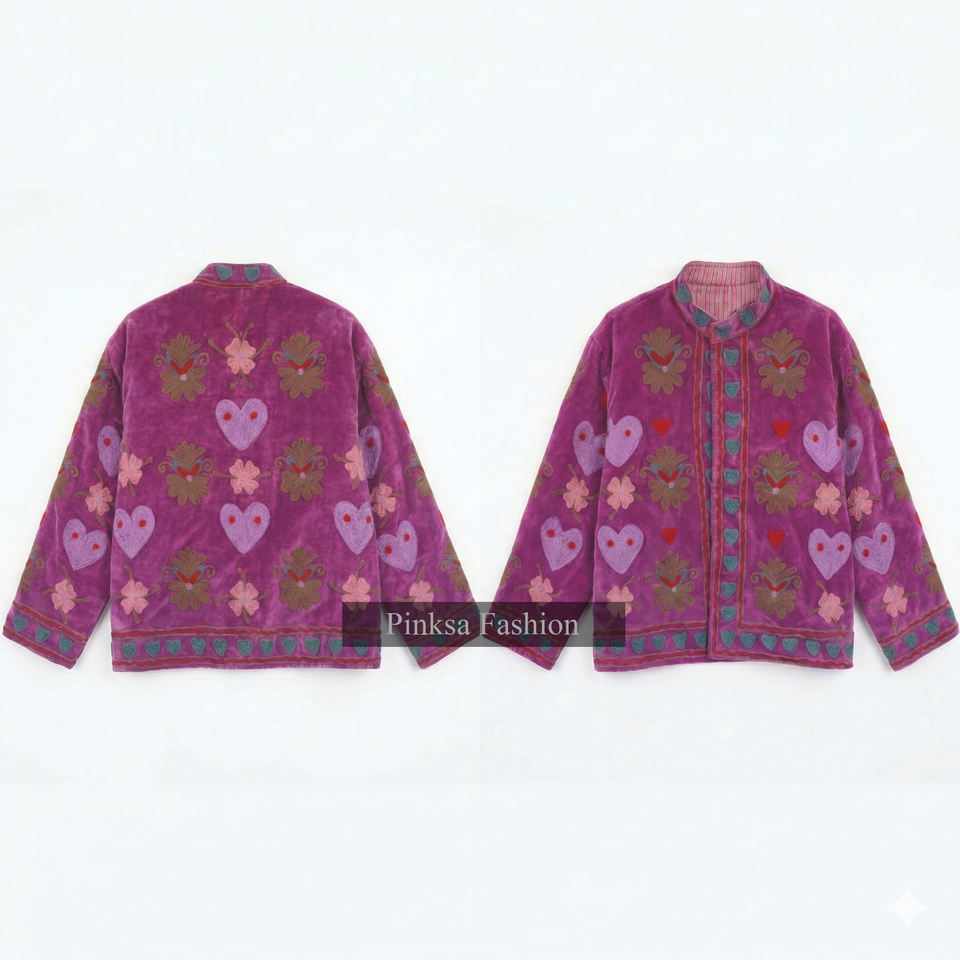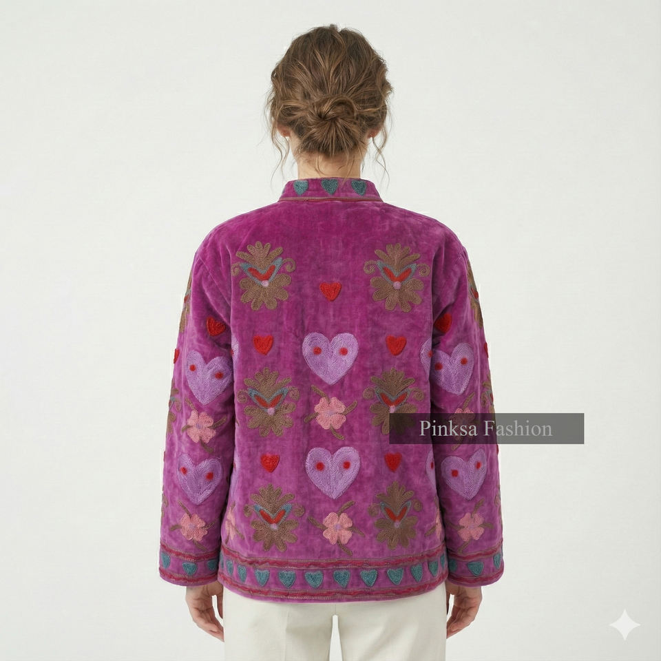 Vintage Ethnic Style Women's Velvet Knitted Cotton Varsity Jacket Hand Embroidered Floral Heart Pattern Quilted Eco-Friendly