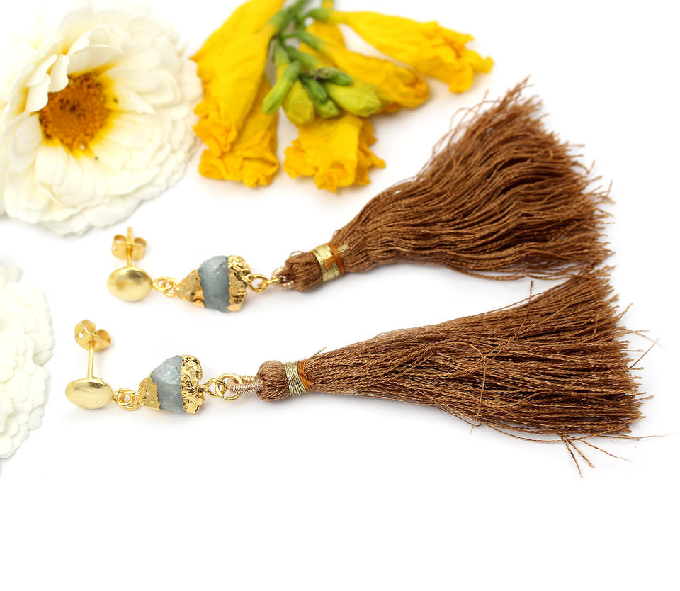 Vintage Fashion Natural Rough Aquamarine Stone Fancy Shape Gold Plated Dangle Drop Tassel Earring Brass Jewelry for Women Girls
