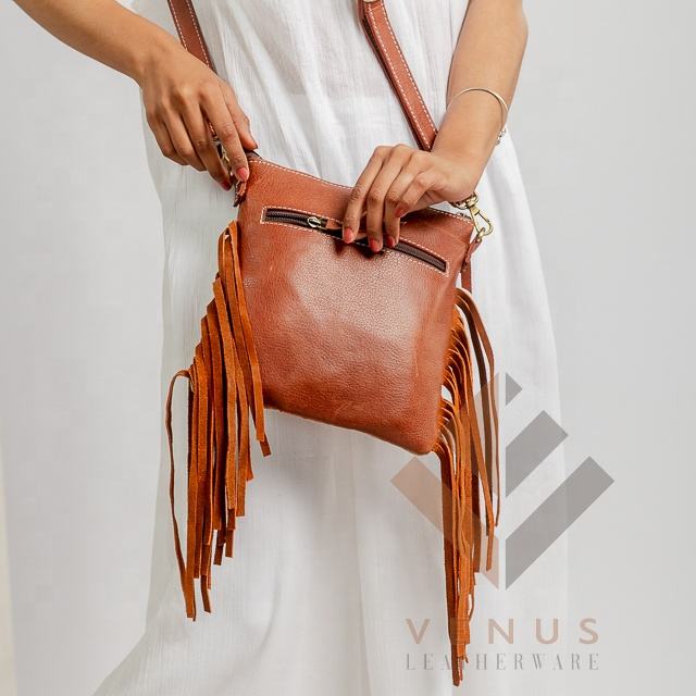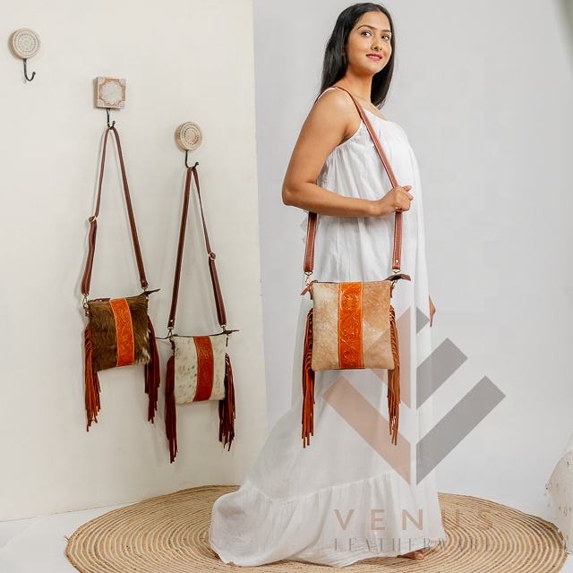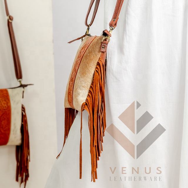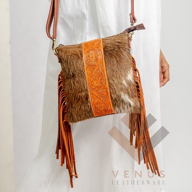 Vintage Fashionable Cowhide Leather Boho Sling Bag Western Fringe Hand Tooled Carving Zip Custom Portable for Spring Autumn