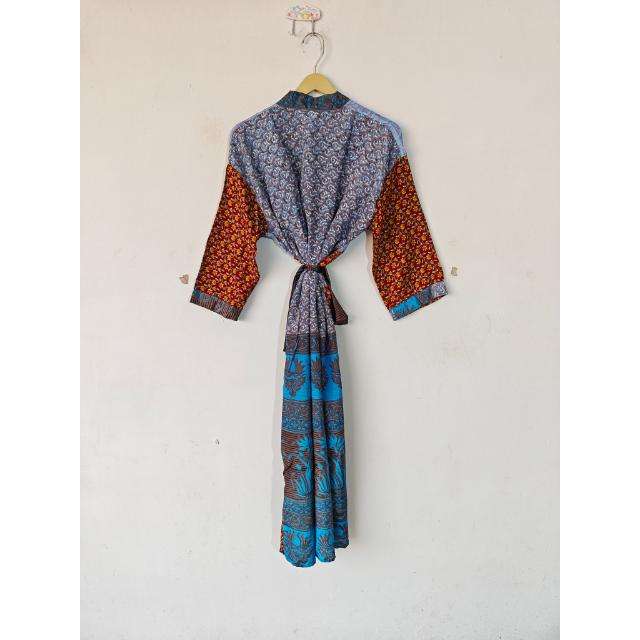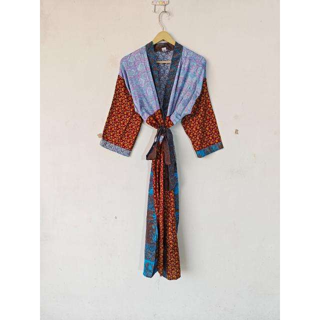 Vintage Floral Design Silk Sari Kimono Robe Comfortable Daily Life Home Dressing Gown Jacket for Autumn Spring Summer Nightgown