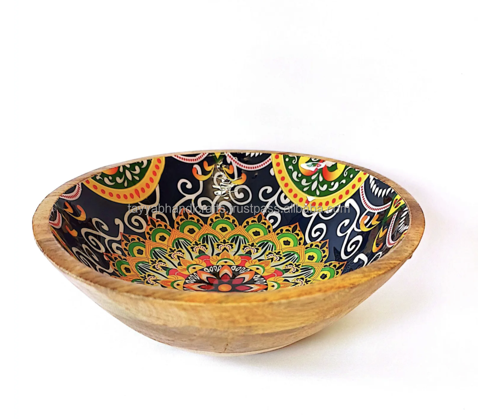 Vintage Floral Pattern Eco-Friendly Classic Wooden Enamel Printed Large Fruit Mixing Bowl with 2 Serving Spoons