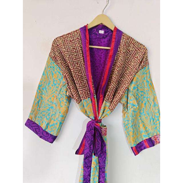 Vintage Floral Silk Sari Kimono Beautiful Flower Design Thermal Nightwear Wrap Robe Sleepwear Dressing Gown for Autumn Season