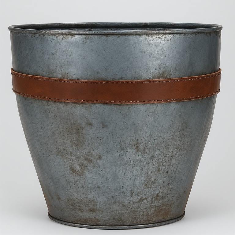 Vintage Galvanised Leather Planter With Brass Base Trim Handmade Artisan Detailing Offering Decorative Accent For Seasonal