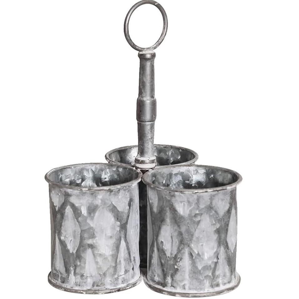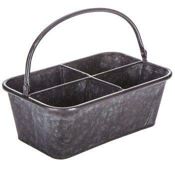 Vintage Galvanized Caddy With Wooden Handle Used As A Decorative Organizer For Farmhouse Style Parties And Country Kitchen Decor