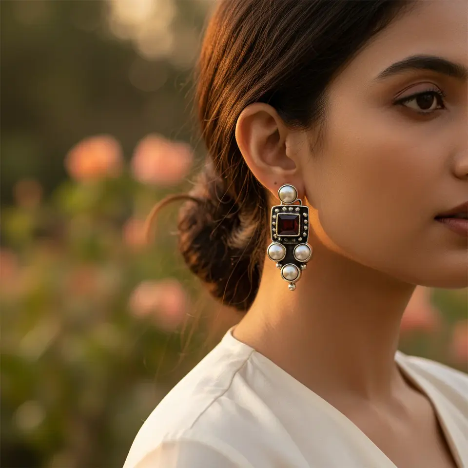 "Vintage Gold-Plated 925 Silver Pearl & Garnet Flower Drop Earrings for Women"