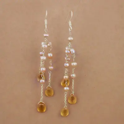 "Vintage Gold-Plated 925 Silver Pearl & Citrine Drop Pendant Earrings for Women"