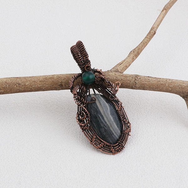 Vintage Green Jasper Gemstone Brass Pendant Copper Plated Wire Wrapped Boho Fashion Jewelry Gift for Her Handmade