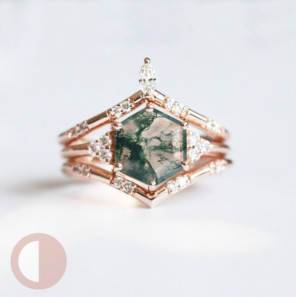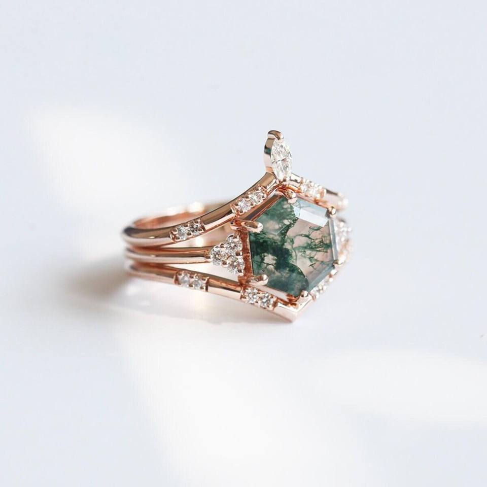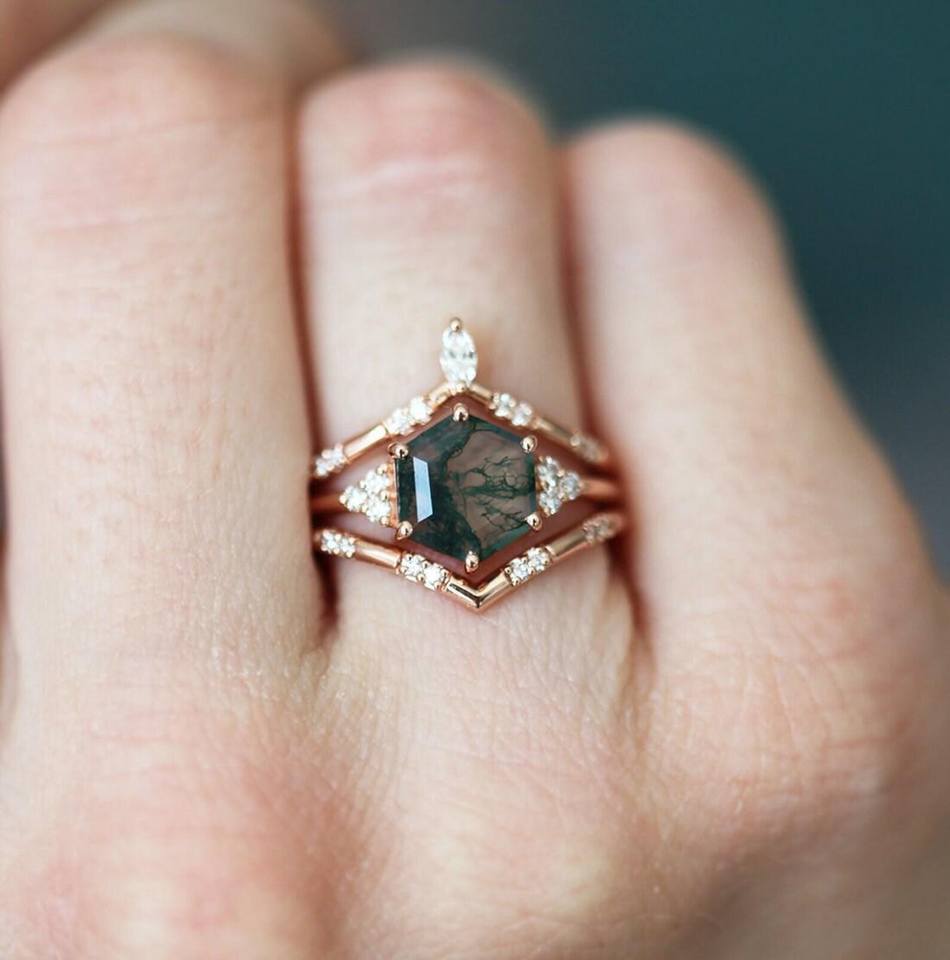 Vintage Hexagon Cut Moss Agate With Round Cut Natural Diamond Engagement Ring Set 14k Rose Gold Green Moss Agate Wedding Ring