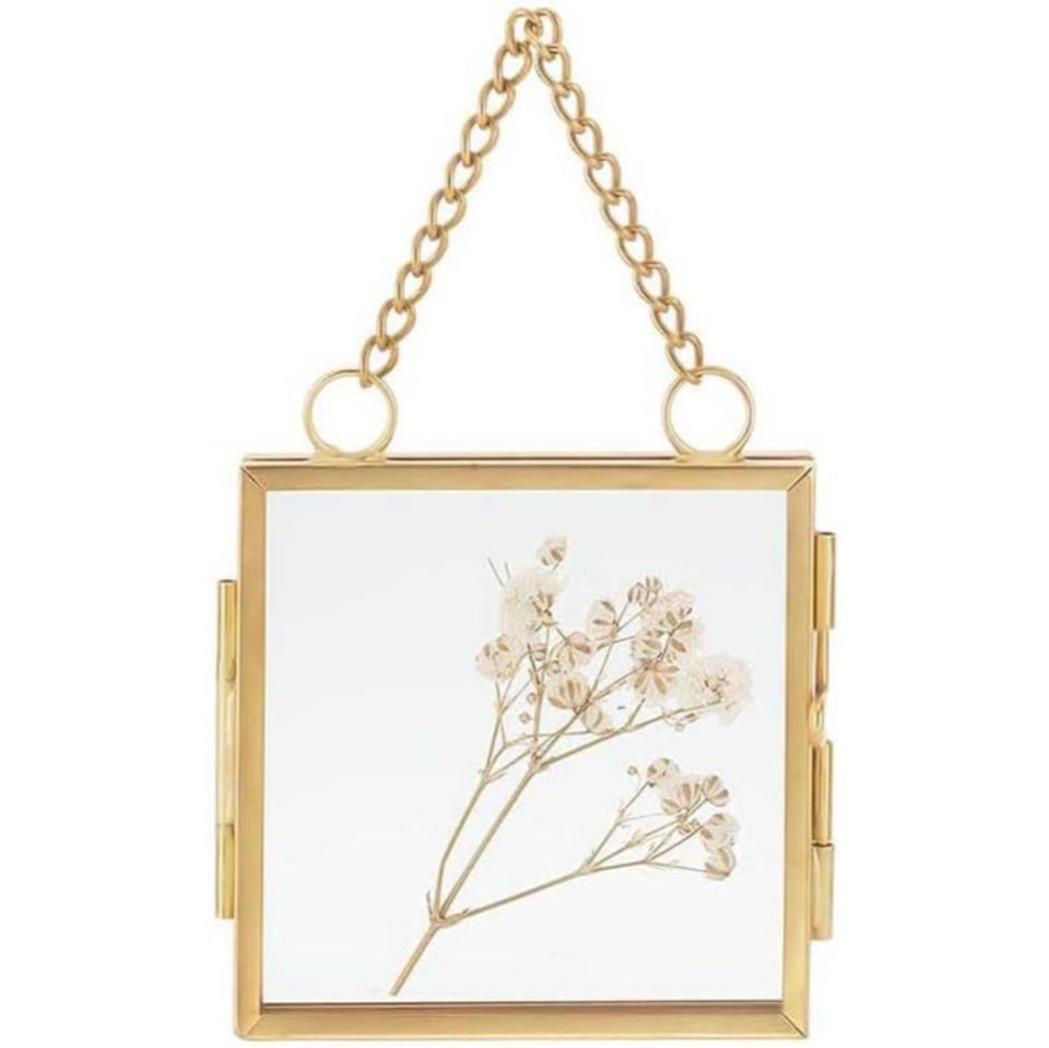 Vintage Hexagon Hanging Glass Frame, Double Sided Gold Metal Brass Floating Picture Frame For Pressed Flowers Wall Display