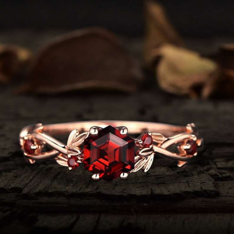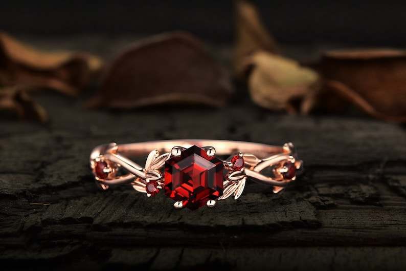 Vintage Hexagon Oval Cut Garnet IGI Certified 925 Sterling Silver 14k Rose Gold Plated Leaf Twig Promise Ring for Women