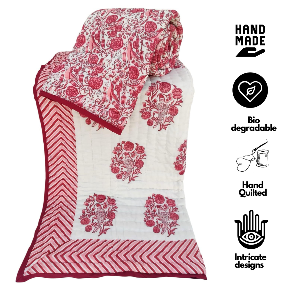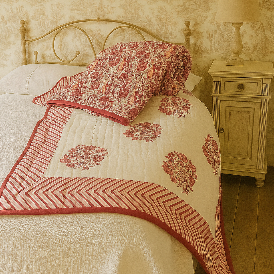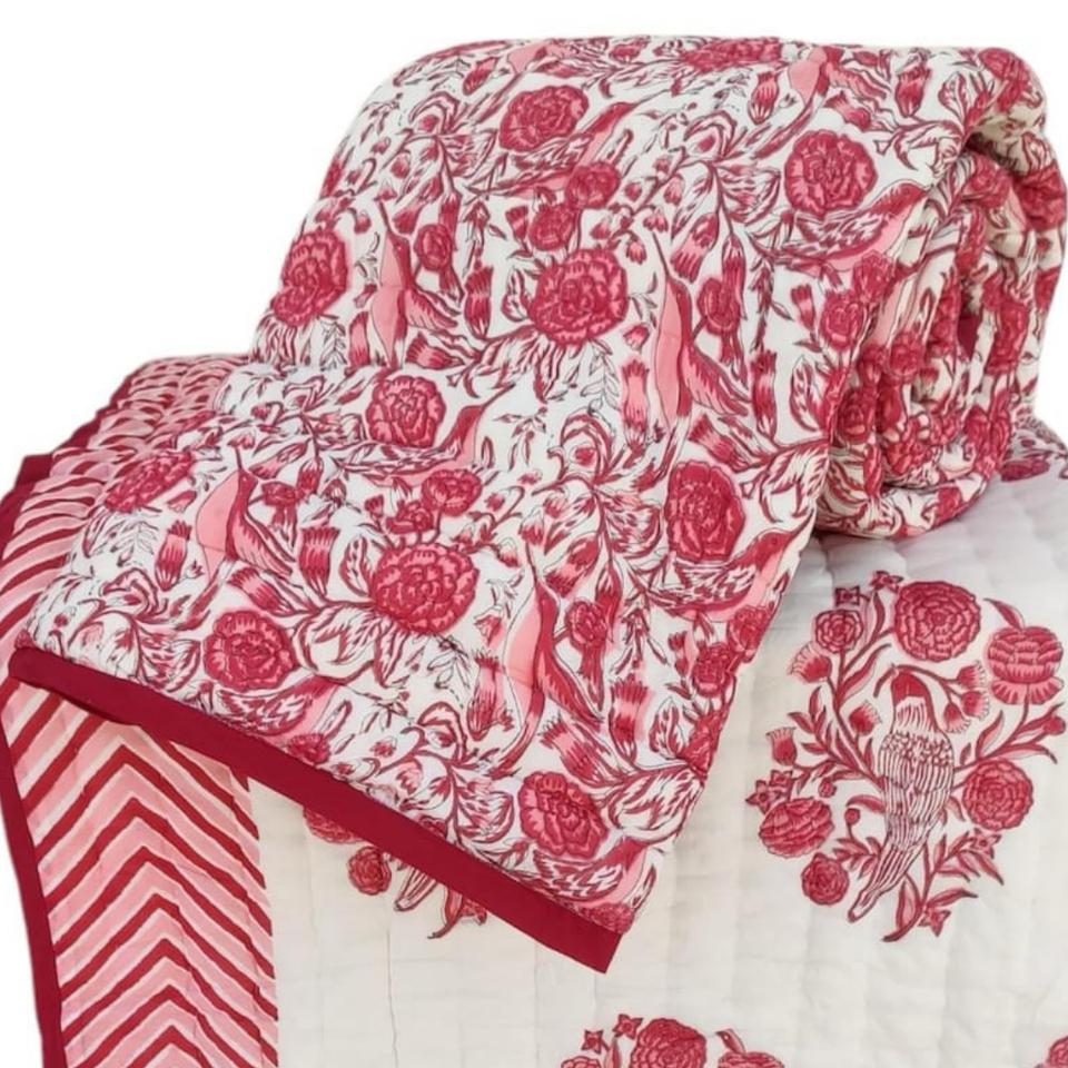 Vintage Indian French fusion Quilt Chevron Border Reversible White Pink Bird Block Print Comforter Artisan Bedding Export Cotton