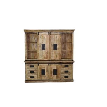 Vintage Industrial Mango Wood Kitchen Hutch Buffet Cabinet Large Open Shelves with Storage Drawers Sliding Doors for Living Room